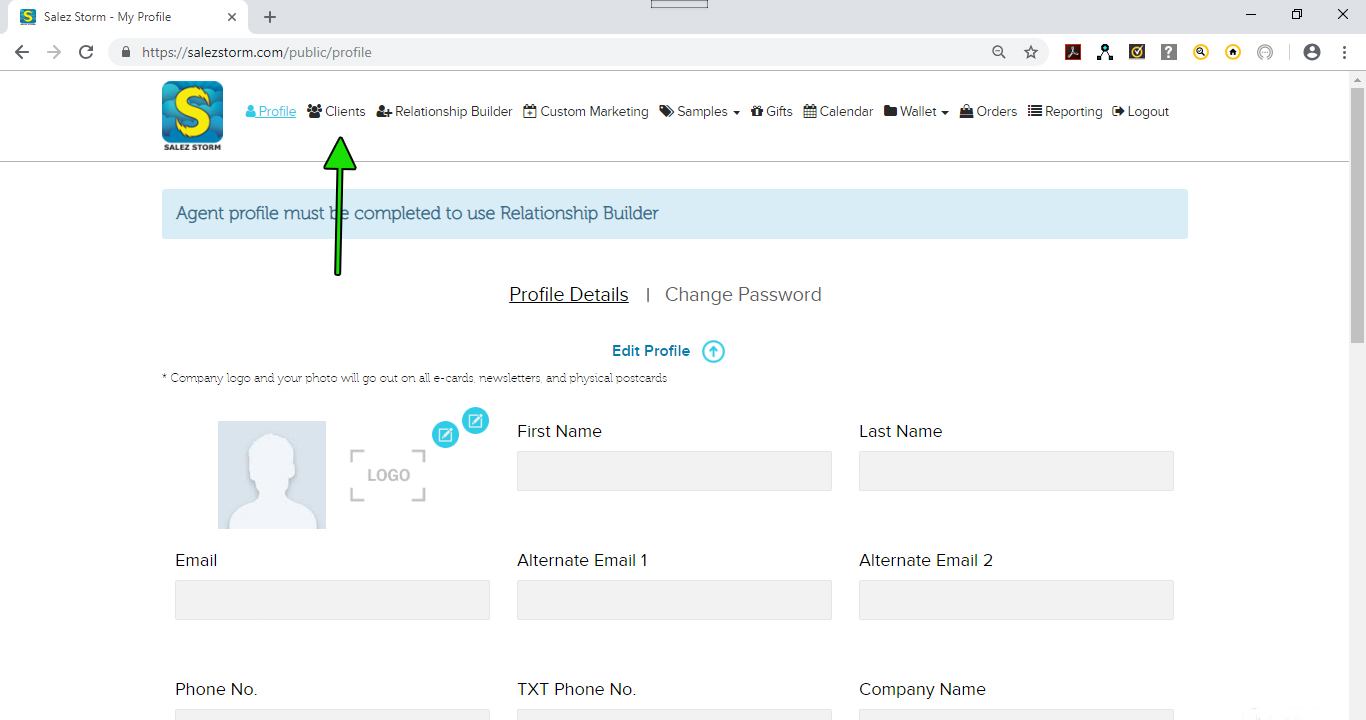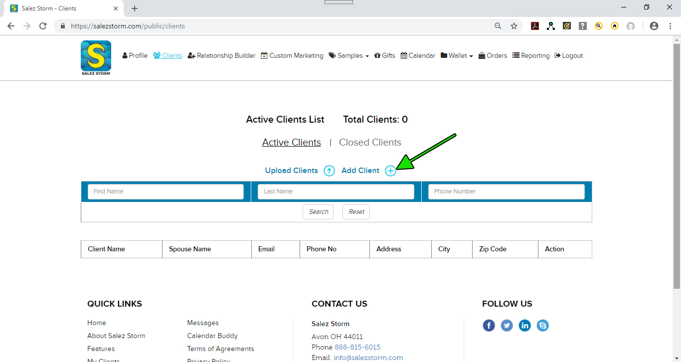 After logging in to your account, navigate to the “Clients” link found in the main navigation menu of the site’s header area. When you have clicked this link, you should see an area that displays your “Active Client List” with total number of clients next to it. Since your are brand new, this number will most likely be 0. As you add clients to your list, this number will increase. The more clients that are in your system, the more contacts Salez Storm can make to your database and potentially bring in more business.