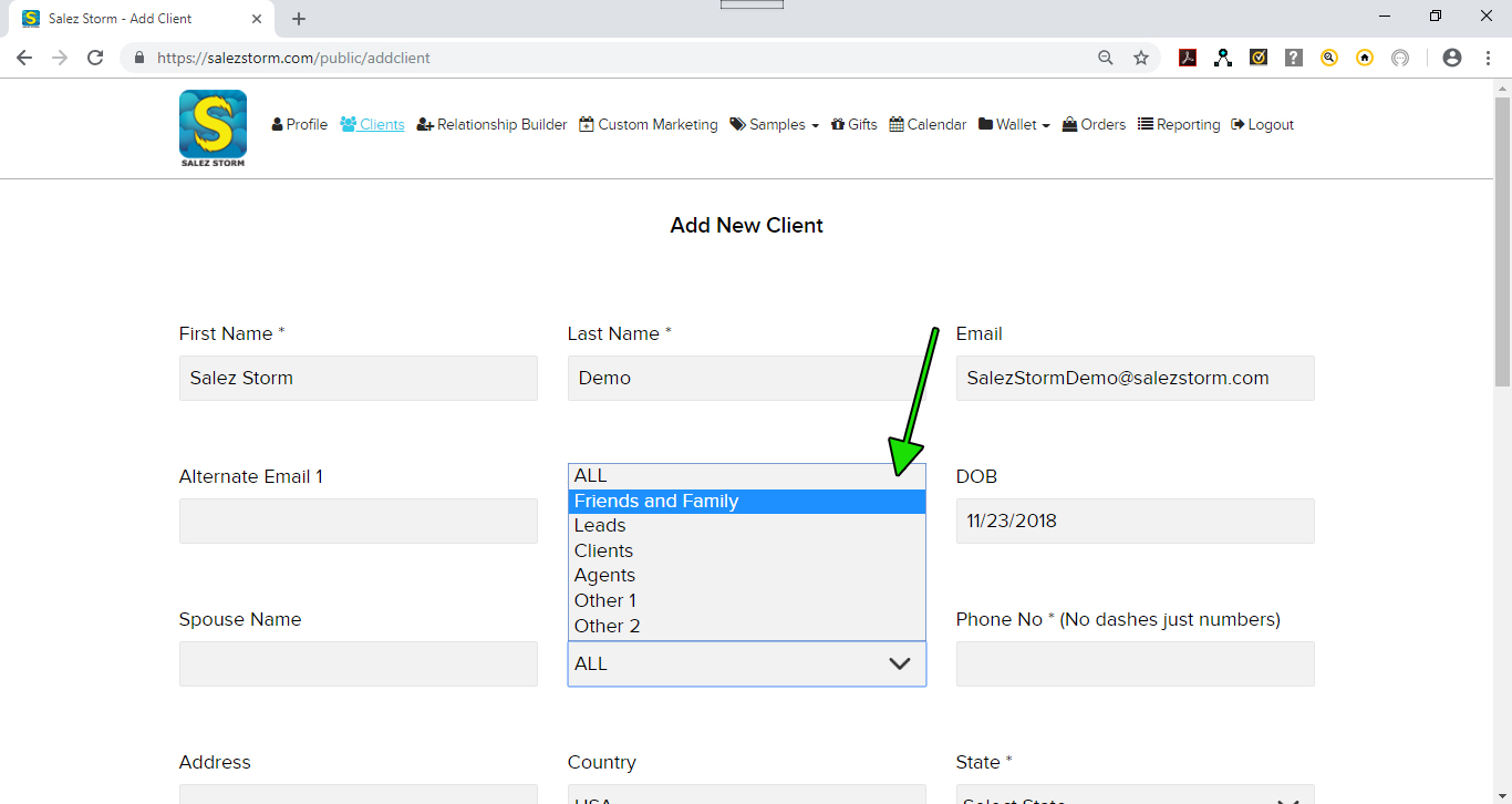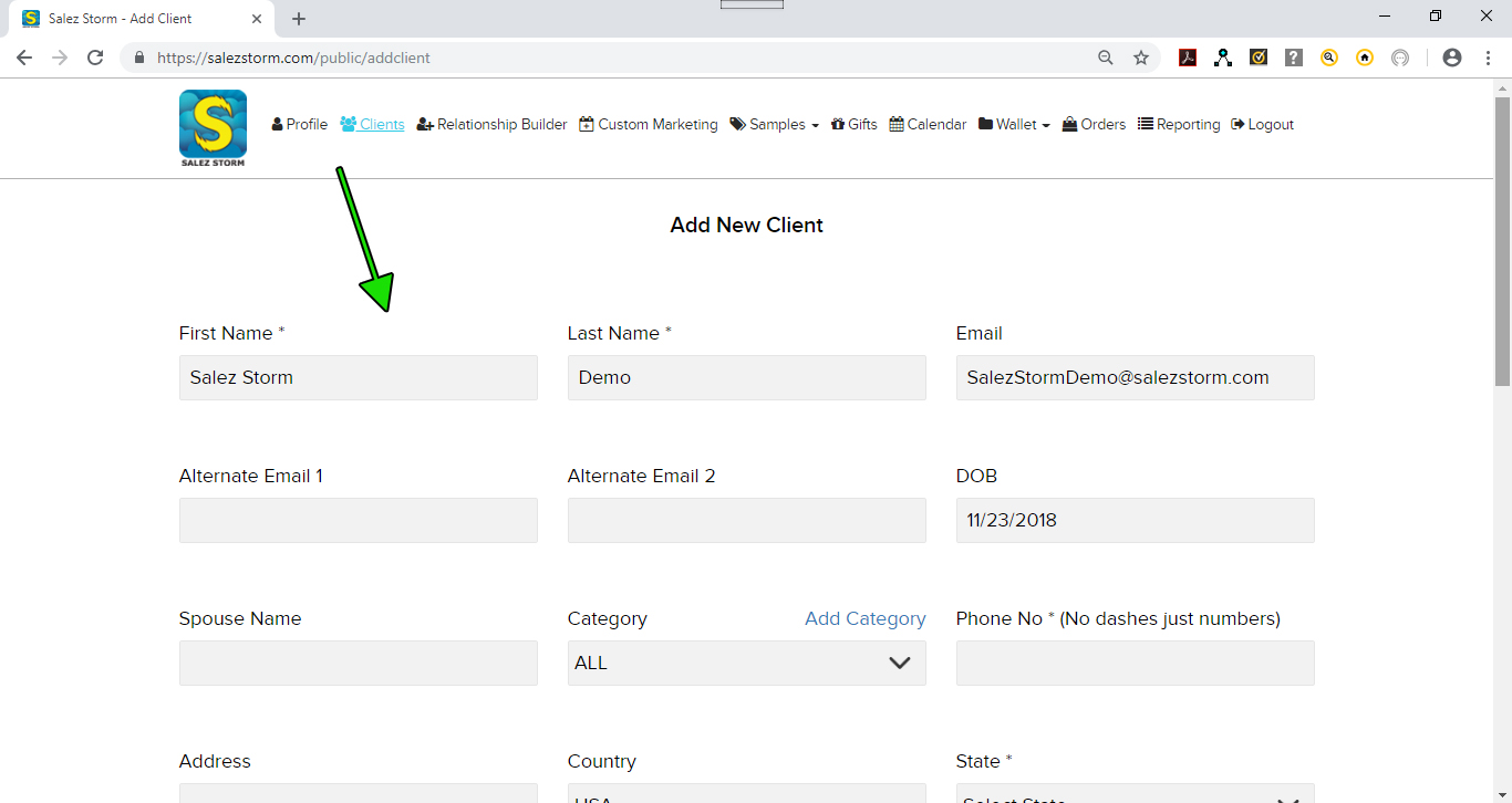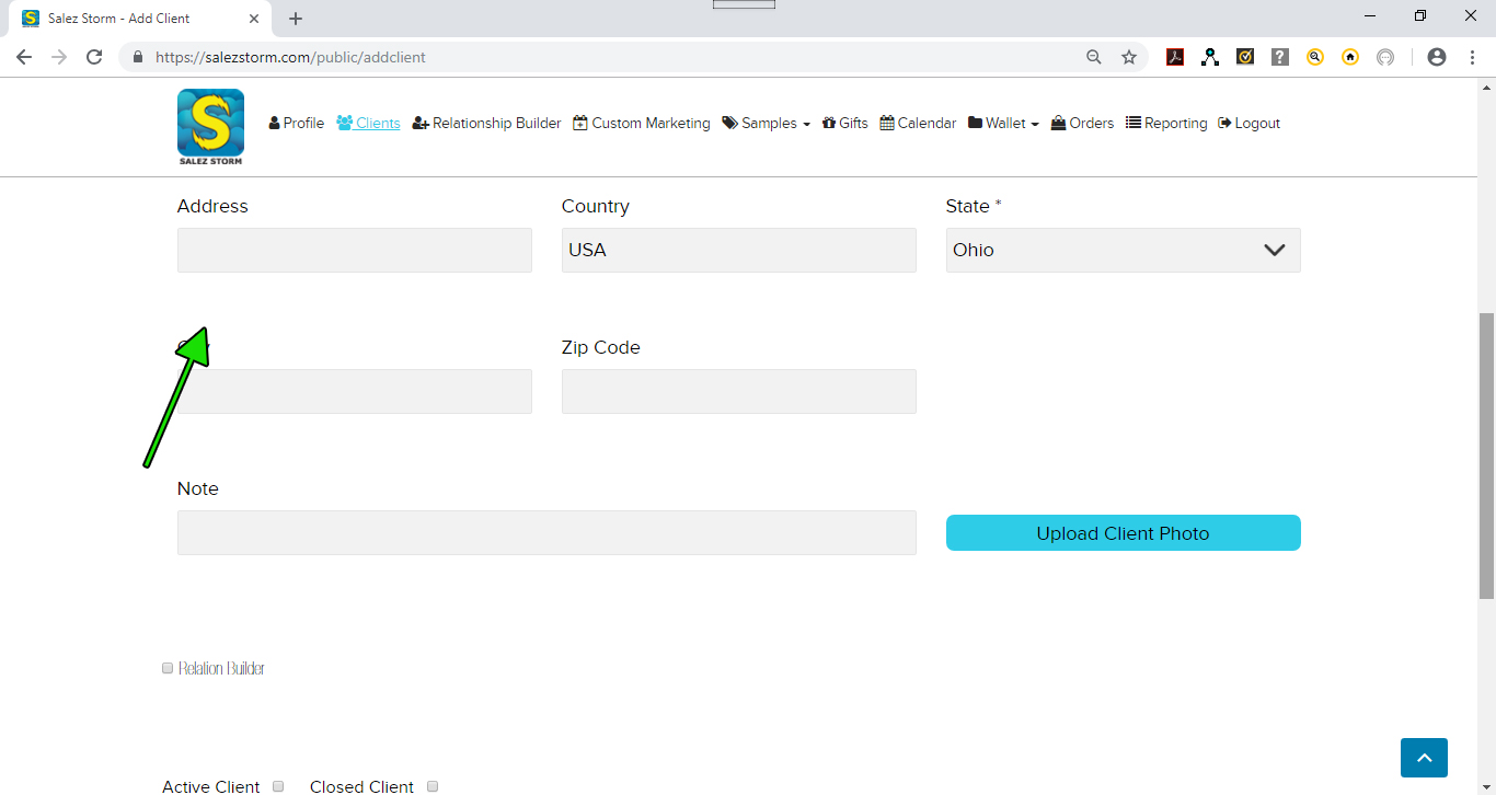 Locate the “Add Client” link and click it. This will take you to a new screen that will allow you to manually add any pertinent information that you have about your client. It is important to remember to add in as much info that is available and to add it in accurately. Salez Storm will be using this info when sending messages and notifications to clients and 3rd party vendors associated with the programs. Accurate and properly formatted information will ensure proper delivery and happy clients.