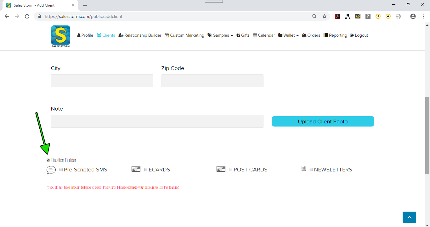 Towards the bottom of the “Add Client” page, you will see a small box to check that says “Relation Builder” next to it. Selecting this or “ticking” the box will open additional boxes that read “Pre-Scripted SMS”, “Ecards”, “Post Cards”, and “Newsletters”. It is here that you will select which form or forms of communication that you would like Salez Storm to automatically make on your behalf for this client. You can select as many of the options as you like, however it is important to know that “Post Cards” require you to have added money to your “Wallet” area in order for the “Post Cards” to be sent. We will look at this in a future email. SMS, ECards, and Newsletters come with your subscription and can be selected without needing to add additional funds to your account.