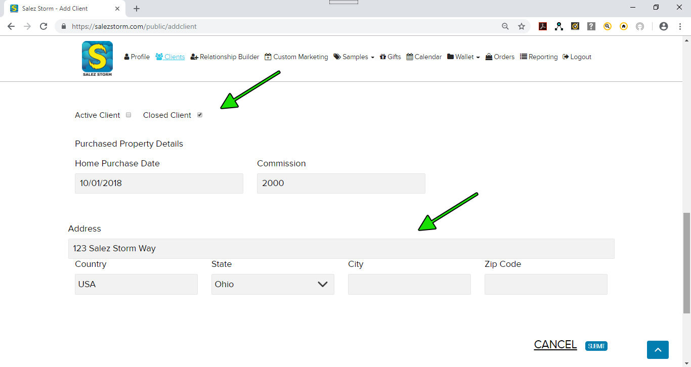 At the very bottom, please select whether this is an “Active Client” that you are currently working with or a “Closed Client” that you have already done business with. Since Salez Storm is geared towards Real Estate deals, Salez Storm can track your past deal information for each client as well. When you select “Closed Client”, additional fields and options will appear to allow you to add this info. You can add the date of the home or property sale, the commission that you earned or bonus you were paid, and the physical address of the location or property that was sold.
