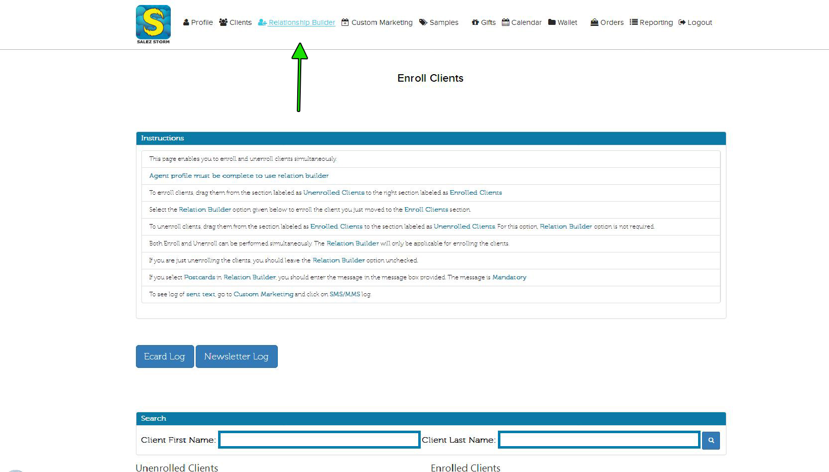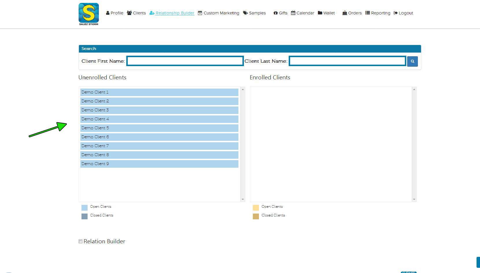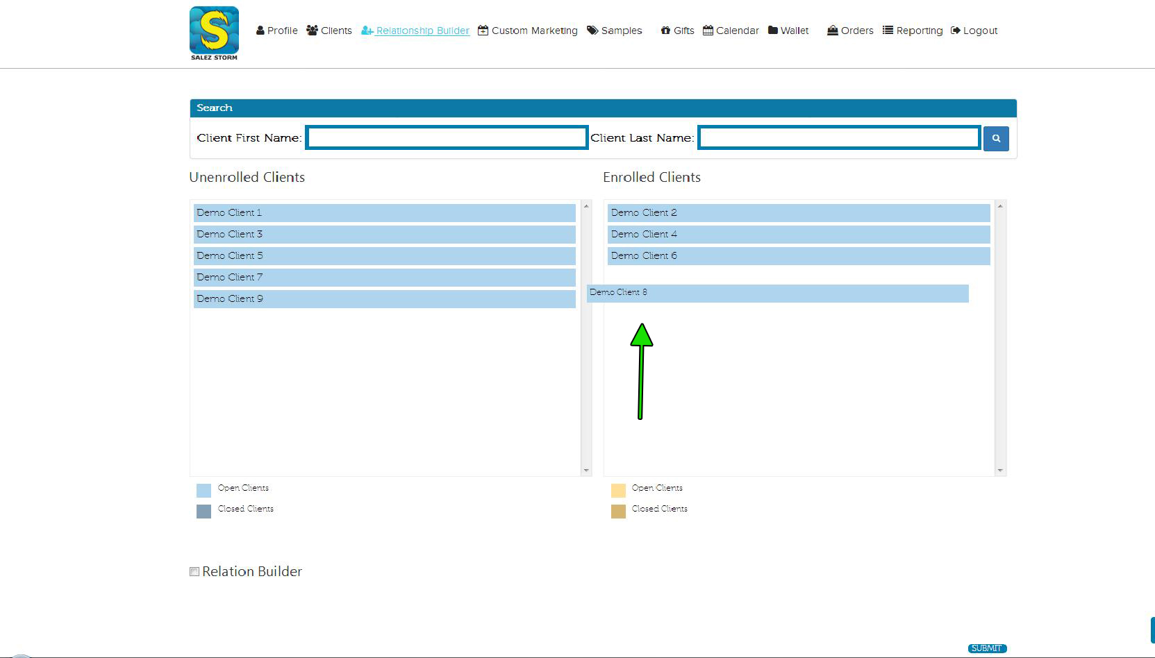 This process can also be reversed to remove Relation Builders simply move dragging the appropriate clients to the left side of the list titled “Unenrolled Clients” and clicking the submit button.