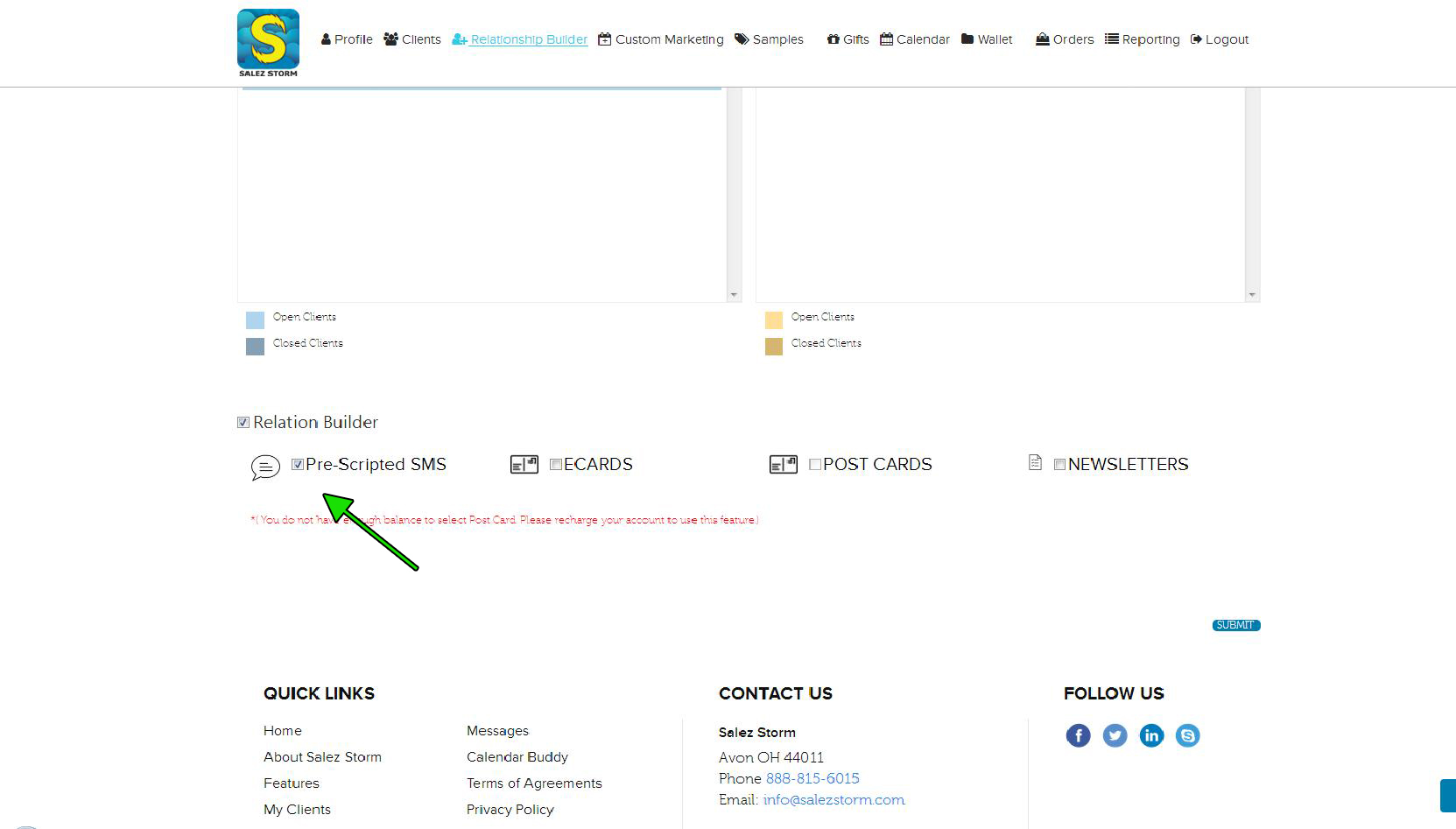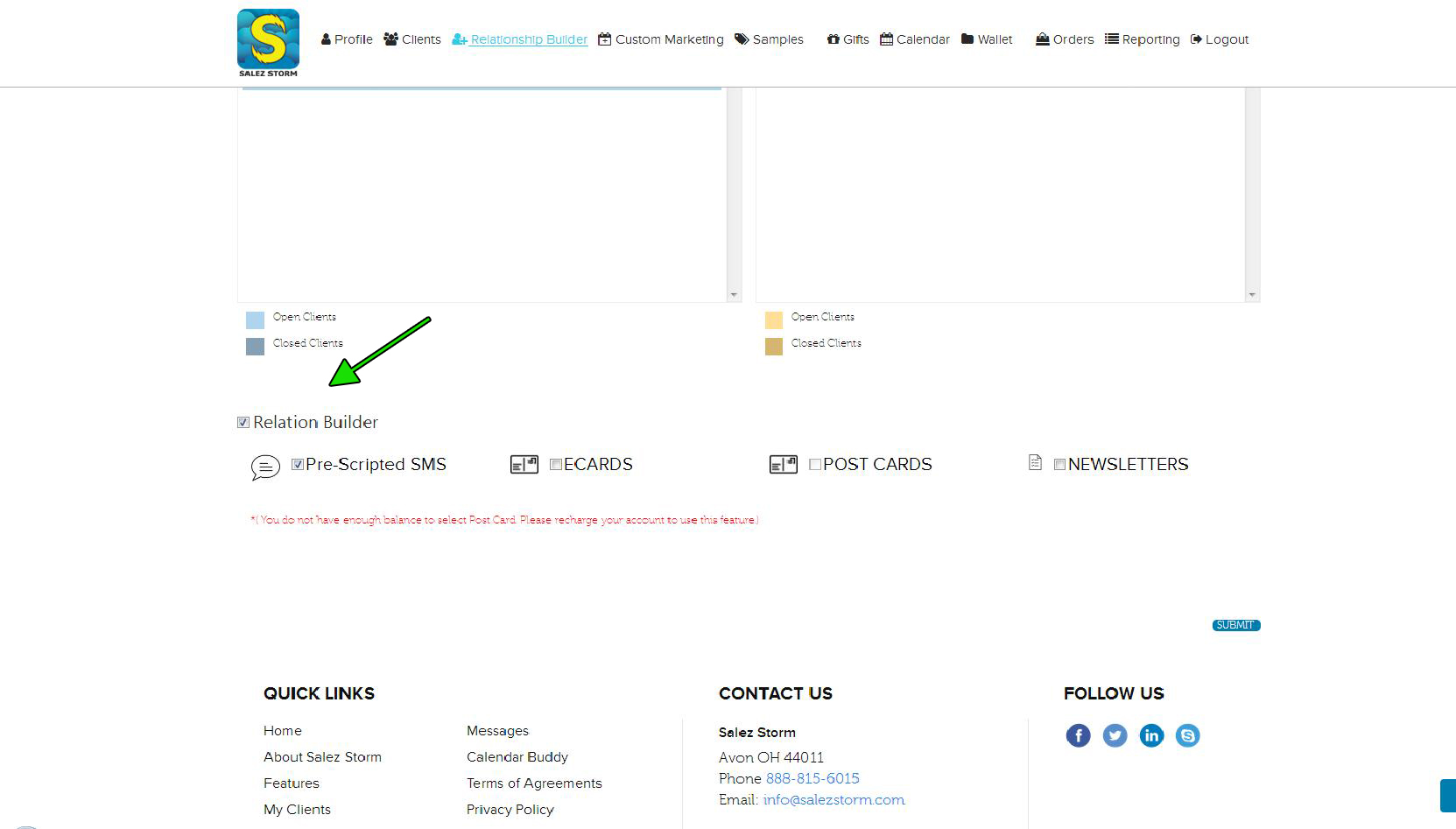Select all Relation Builders that you would like to enroll the above list of clients into. Some Relation Builders may not be available to use if you have a basic or free account. These are only available with paid subscription plans that have enough credits available for use in the “Wallet”. Some of the Relation Builders also require you to select additional categorical type information. These option will appear when necessary. Choose the proper category for each relationship builder that you would like to assign.