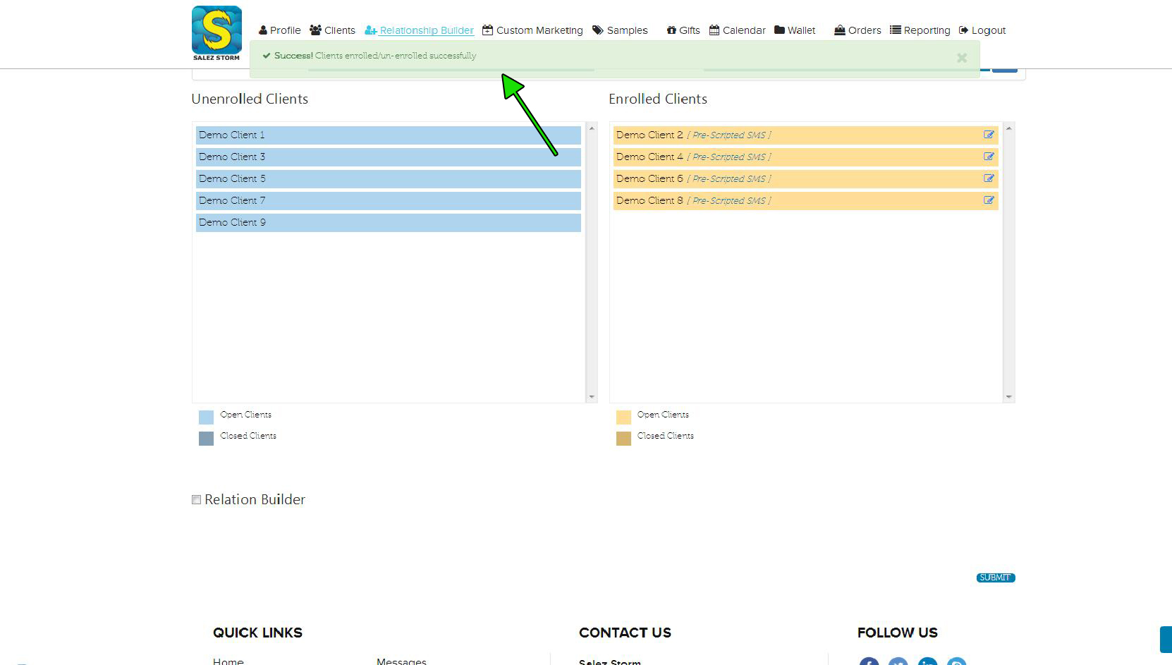 After all clients that you are interested in enrolling have been moved to the “Enrolled List” and the appropriate Relation Builders have been chosen, click the “submit” button. You will see a success notification if all clients have been properly enrolled. If an error has occurred, the success notification will be replaced with a warning. If a success notification has been received, you are all set and no further action is needed.